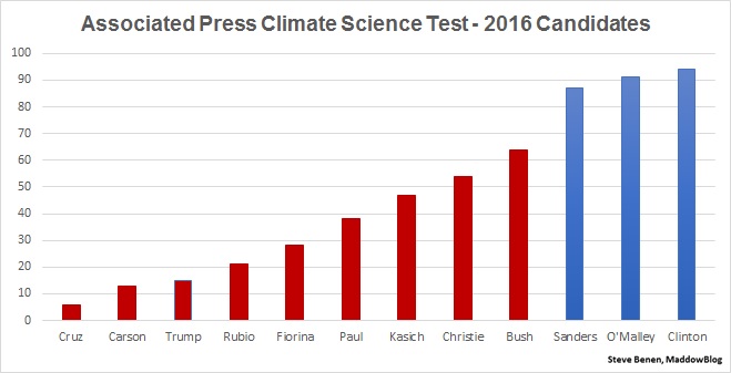 The Associated Press invited eight climate and biological scientists to grade the scientific accuracy of candidates in both parties. The material included debates, published interviews and tweets. The candidates’ names were not known to the reviewers. As an added protection against bias, the scientists were selected by professional scientific societies.The grades, which ran from 0 to 100, were mostly abysmal. Texas Sen. Ted Cruz was the strongest and the wrongest, receiving a grade of 6 points for accuracy. All eight evaluators placed Cruz dead last. Michael Mann, a Pennsylvania State University meteorology professor, wrote of Cruz’s statements: “This individual understands less about science (and climate change) than the average kindergartner.”