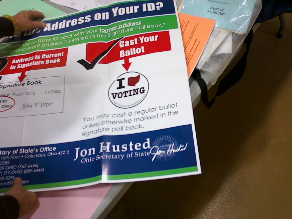 Among the last decisions going into the election concerned the informational posters that would be displayed at the polling places about voter ID requirements and so on. Like a lot of states, Ohio has strict rules about campaigning inside or near polling places. You’re not allowed to wear campaign badges or shirts, for instance, whether you’re an ordinary voter or a poll worker. Those informational posters ordered up by Secretary of State Husted featured his name in large print. When Democrats on the elections board in Hamilton County, Ohio, objected to that as electioneering, Husted ordered them to display the posters.