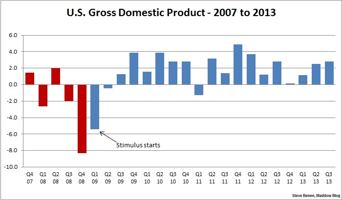 As for the image above, the chart shows GDP numbers by quarter since the Great Recession began. The red columns show the economy under the Bush administration; the blue columns show the economy under the Obama administration.