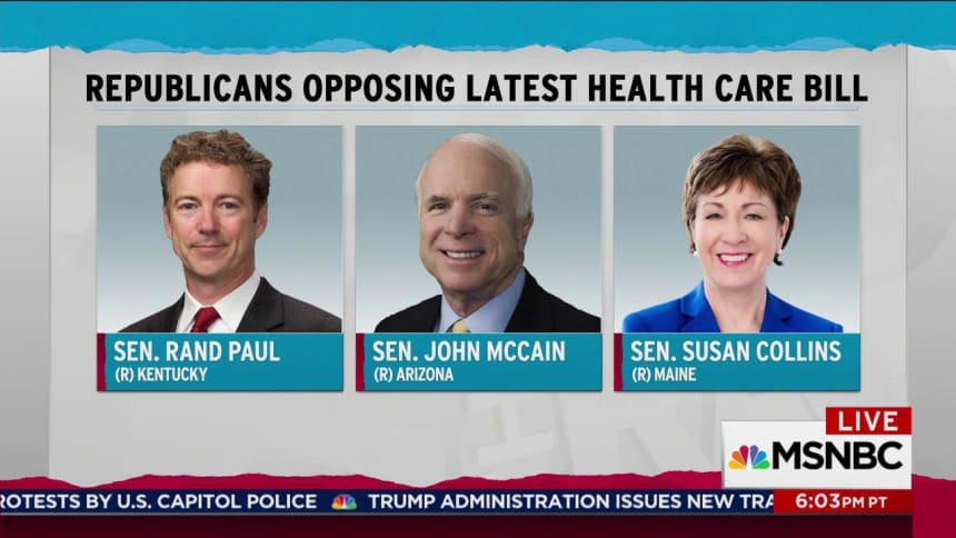 Collins joins Sens. John McCain of Arizona and Rand Paul of Kentucky as GOP “no” votes. Unless one of them switches their position, Republicans can’t muster the 50 voted needed to pass it.