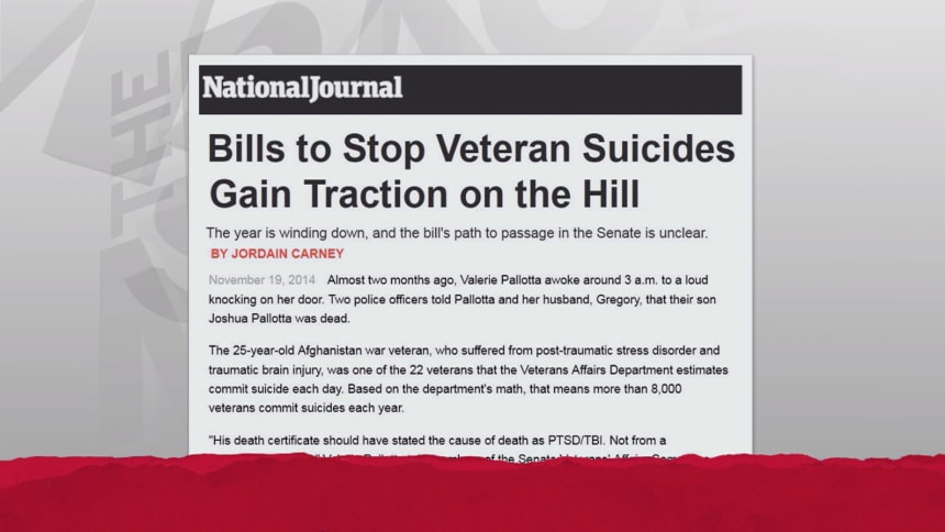“Twenty-two veterans a day are committing suicide. They want more psychiatrists in the V.A., independent, outside evaluation, to make veterans and Defense Department suicide programs better programs. It has a plan that they think would stop the merry-go-around of medications that vets get put on they say by the handful to instead focus on what really works.“This bill is not the most expensive bill in the world, certainly not getting the most attention in the world, but it gets at this terrible problem in all the ways the veterans groups think would most help them.”