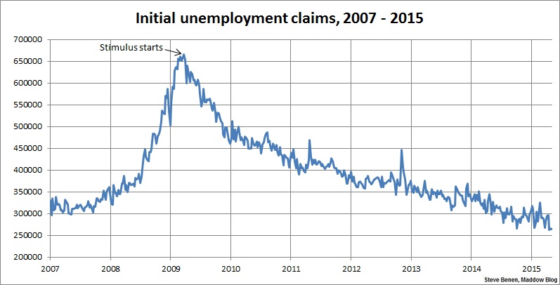 Above you’ll find the chart showing weekly, initial unemployment claims going back to the beginning of 2007. (Remember, unlike the monthly jobs chart, a lower number is good news.) For context, I’ve added an arrow to show the point at which President Obama’s Recovery Act began spending money.