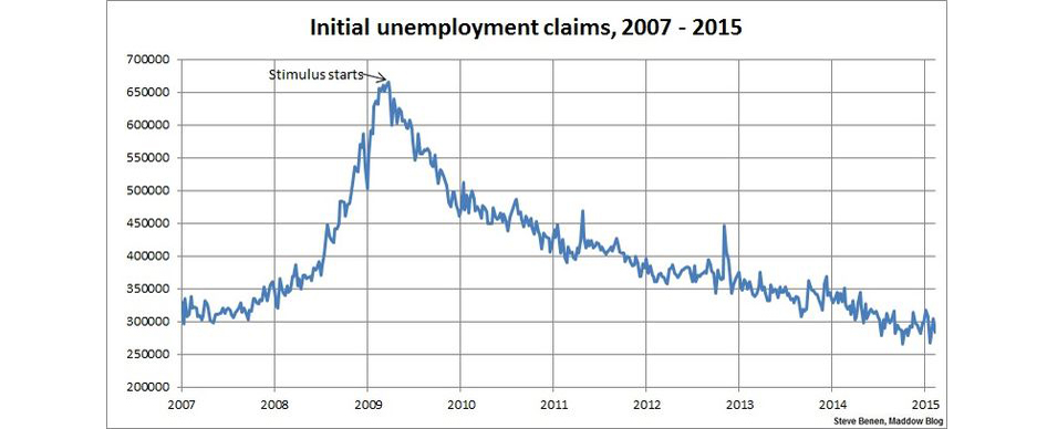 Above you’ll find the chart showing weekly, initial unemployment claims going back to the beginning of 2007. (Remember, unlike the monthly jobs chart, a lower number is good news.) For context, I’ve added an arrow to show the point at which President Obama’s Recovery Act began spending money.