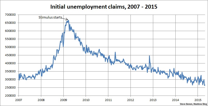 Above you’ll find the chart showing weekly, initial unemployment claims going back to the beginning of 2007. (Remember, unlike the monthly jobs chart, a lower number is good news.) For context, I’ve added an arrow to show the point at which President Obama’s Recovery Act began spending money.