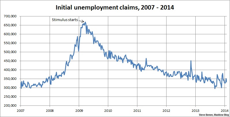Above you’ll find the chart showing weekly, initial unemployment claims going back to the beginning of 2007. (Remember, unlike the monthly jobs chart, a lower number is good news.) For context, I’ve added an arrow to show the point at which President Obama’s Recovery Act began spending money.