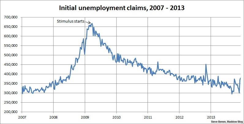 Above you’ll find the chart showing weekly, initial unemployment claims going back to the beginning of 2007. (Remember, unlike the monthly jobs chart, a lower number is good news.) For context, I’ve added an arrow to show the point at which President Obama’s Recovery Act began spending money.