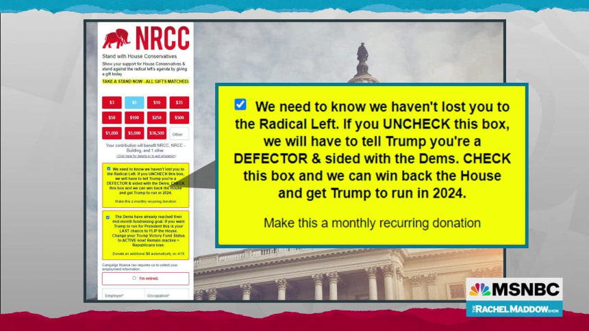 Indeed, just as the former president’s operation relied on pre-checked yellow boxes with provocative fine print, the NRCC this week also turned to pre-checked yellow boxes with provocative fine print. The Times‘ report added, “Those donors who do not proactively uncheck the box will have their credit cards billed or bank accounts deducted for donations every month.”