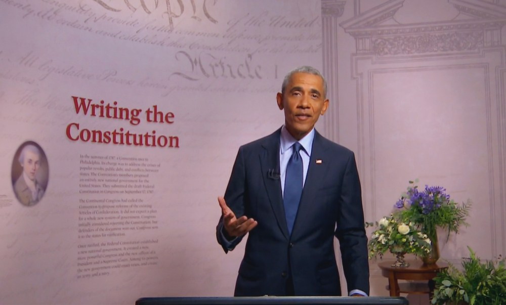 About halfway through the speech, the former president explained that Joe Biden and Kamala Harris “understand that political opponents aren’t ‘un-American’ just because they disagree with you; that a free press isn’t the ‘enemy’ but the way we hold officials accountable; that our ability to work together to solve big problems like a pandemic depends on a fidelity to facts and science and logic and not just making stuff up.”