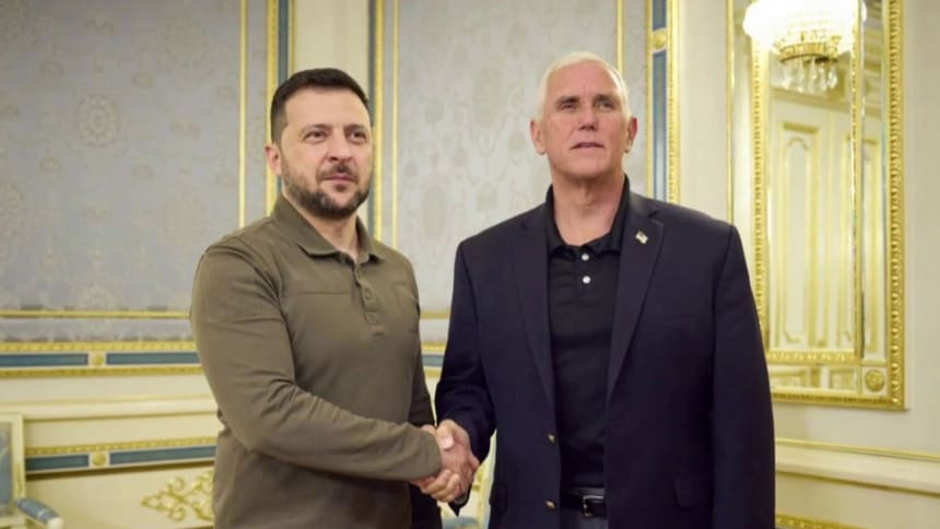 Soon after, the ad features an on-screen quote from Pence — “Weakness arouses evil” — while cutting to a speech in which the former vice president said, “There can be no room in the leadership of the Republican Party for apologists to Putin. There can only be room for champions of freedom.”