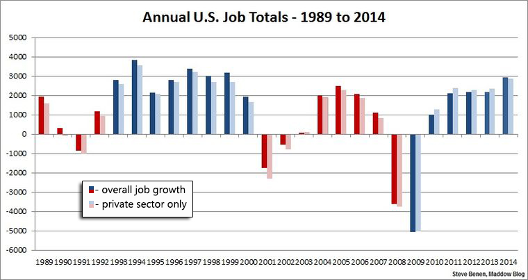 Notice, 2014 isn’t just an encouraging year as compared to other years in the Great Recession era; it’s actually a strong year on its own. Indeed, more jobs have been created this year than in any year of the Bush/Cheney era — or the Bush/Quayle era, for that matter.