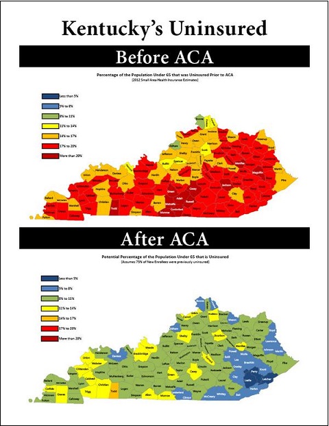 It may be a little hard to see the maps in the video, but Yarmuth tweeted the graphic. The top map shows the uninsured rate in each of Kentucky’s 120 counties — orange and red show the counties with the worst figures. The bottom map shows the shift in each county following the implementation of the Affordable Care Act — green and blue point to the areas with higher percentages of insurance.