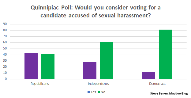 In areas such as age and ethnicity, the differences were modest, but the partisan split was enormous. Among Republicans, a narrow plurality — 43% to 41% — would consider supporting a candidate accused of sexual harassment by multiple women.