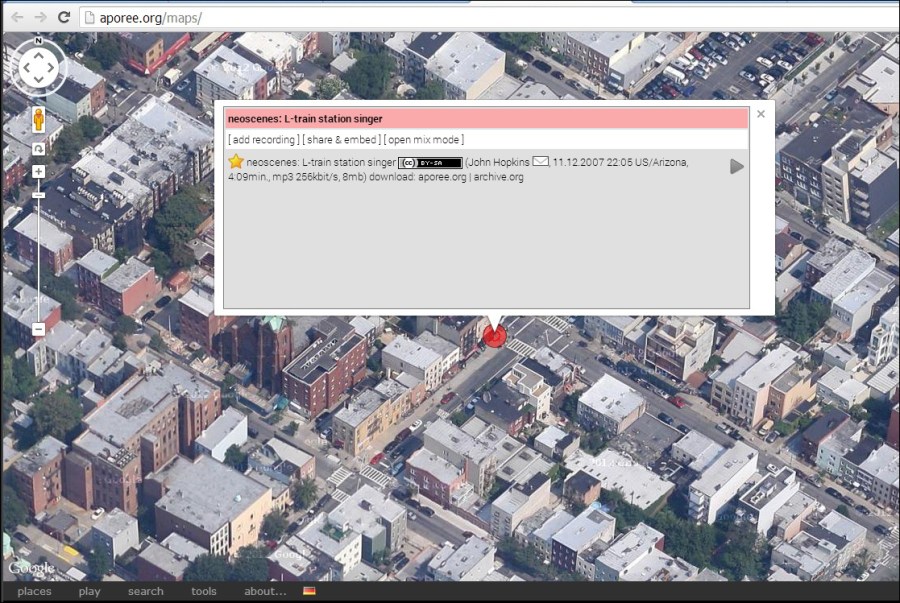My first login started me in Japan, but naturally, the first thing I did was try to find my house. (Everyone does that, right?) In this case the closest I could get was this 2007 audio of the guy who still plays the guitar and sings songs in Spanish at the L train’s Bedford Avenue stop.