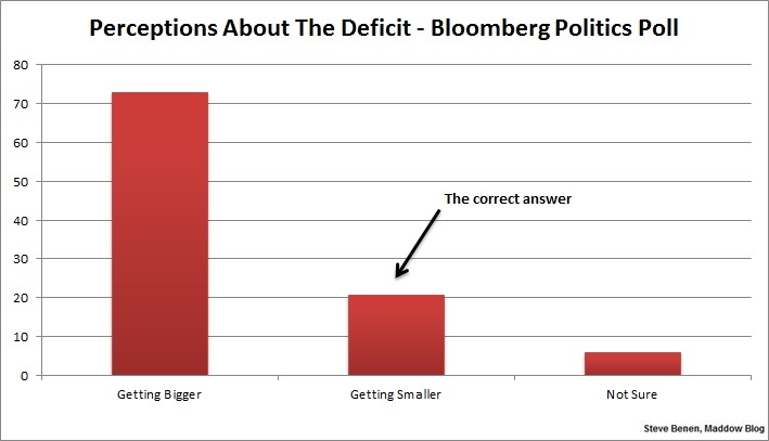 A couple of years ago, a Bloomberg Politics Poll asked the public a good question about the deficit: “Is it your sense that this year the deficit is getting bigger or getting smaller, or is it staying about the same as last year?” It wasn’t even close — despite the fact that the deficit, in reality, was shrinking quickly, only 6% of the public knew that. A 62% majority said they believed it was getting bigger, which was the opposite of the truth.