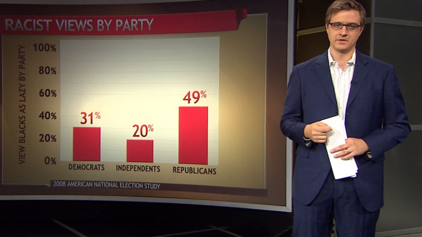 Political scientist John Sides responded to Tabbarok to flesh out the picture a bit. Using data from the 2008 National Election Study he shows that the people who express explicitly racist views—such as that black people are lazy, or that black people are unintelligent—are more likely to be Republicans than Democrats. “Identification with the Democratic Party tends to decline, and identification with the Republican party tends to increase, as attitudes toward blacks become less favorable.”
