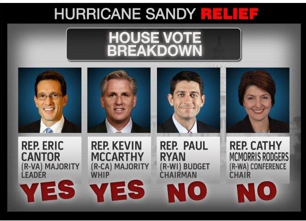 The $50 billion dollar Sandy aid package which passed the House late yesterday didn’t just split Republicans, it divided the House Republican leadership. Majority Leader Eric Cantor and Majority Whip Kevin McCarthy voted for the bill. Budget Chairman Paul Ryan and Conference Chair Cathy McMorris Rogers voted against it.