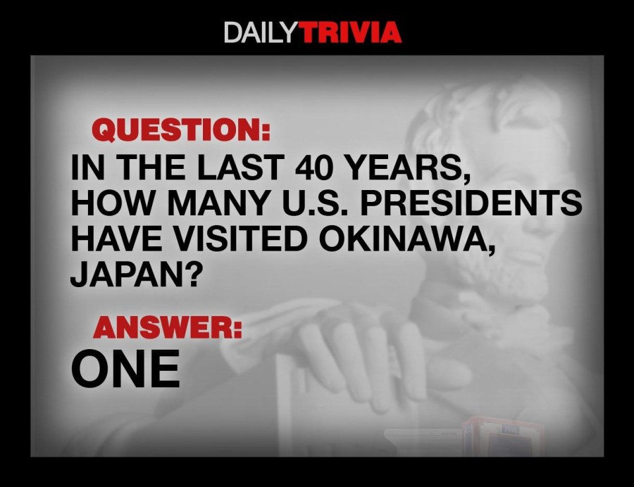 Only one U.S. president has visited Okinawa, Japan in the last 40 years. In 2000, President Clinton became the first American president to visit the island since the U.S. returned Okinawa to Japan in 1972. No president has been there since.