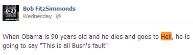 Yet another GOP official has come down with Obamaphobia. Bob FitzSimmonds, treasurer of the Virginia Republican Party’s State Central Committee and a close ally of Virginia gubernatorial candidate Ken Cuccinelli, posted a comment on his Facebook page Wednesday about Barack Obama’s tortured afterlife: