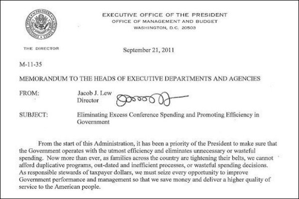 Lew signed this government memo titled “Eliminating Excess Conference Spending and Promoting Efficiency in Government,” in which it specifies ways the government can increase efficiency and create cost-cutting measures. This really is his signature. There are eight loops, one loop for each letter in his full name, Jacob Lew.