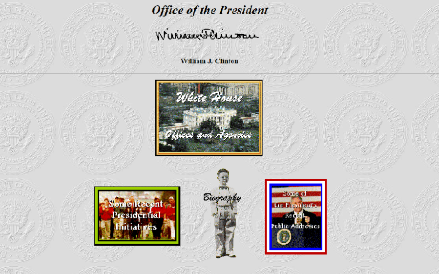 The first icon of the homepage is a landing page for the Executive Branch, where it lists the White House offices and agencies, recent presidential initiatives, recent public addresses, and a biography that is accompanied by a photo of young Bill Clinton.