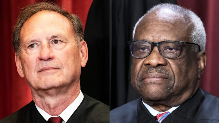 Senate Democrats accuse Thomas of violating federal law by failing to recuse himself in cases that involved the political interests of his wife, Ginni Thomas, including the attempt to subvert the 2020 election results. Alito also “engaged in conduct that created an appearance of impropriety,” according to the report, citing the flags flown by his wife on their properties in response to the 2020 election interference effort.